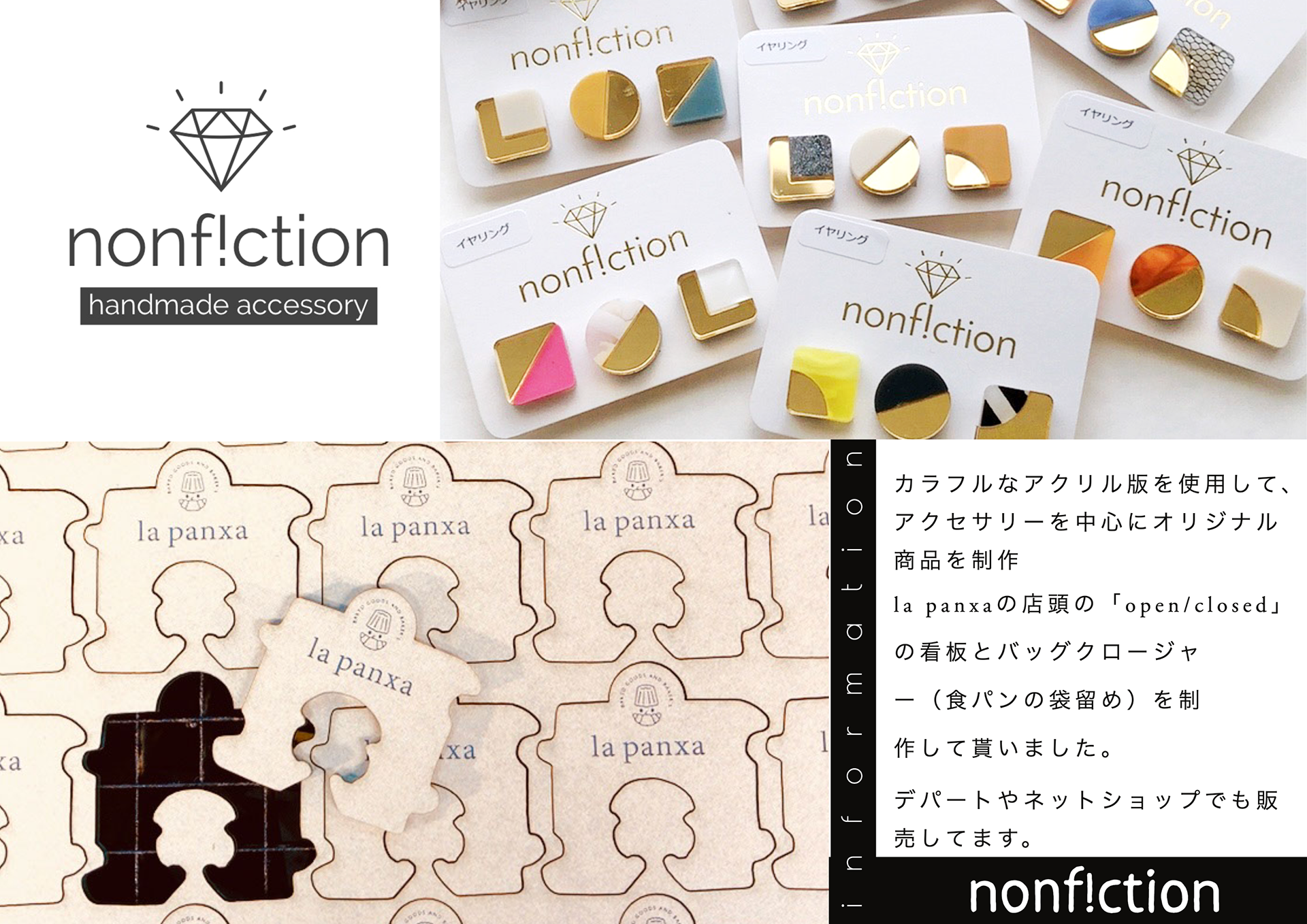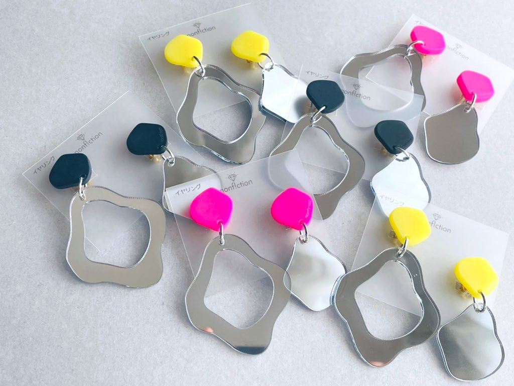 カラフルなアクリル版を使用して、アクセサリーを中心にオリジナル商品を制作しています。 デパートやネットショップでも販売してます。